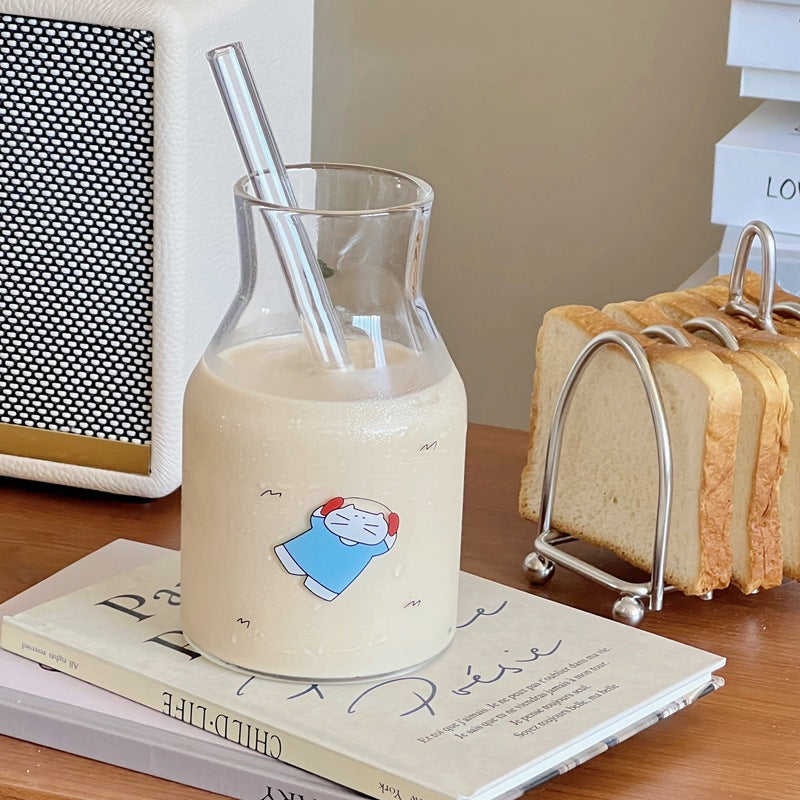 Sip happy vibes with these super-cute glass bottles 🐻☁️💙 Perfect for milk, smoothies, iced coffee, or your favorite fruity drink! Each bottle comes with an adorable doodle design—whether it’s a cheerful bear, a sleepy kitty under the rain, or a dreamy character floating away. 🌸🥛 Not just drinkware, but a little piece of joy to brighten your desk, kitchen, or café corner! 💕